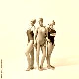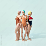 Three stylish women in colorful vintage swimwear posing together with elegance and confidence against light blue background. Concept of swimsuit fashion, retro vibe, unity, beauty, vacation energy