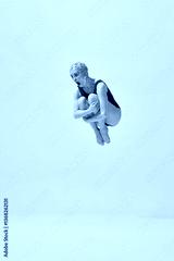Diver in red vintage swimsuit and orange cap making cannonball pose in air with comic expression. Concept of summer fun, playful holiday, vintage swimsuit style, humor, retro sport.