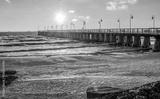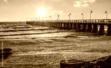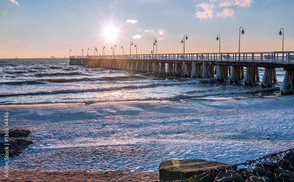 Molo w zimowej scenerii, zimowy poranek, wschód słońca.