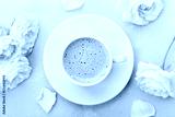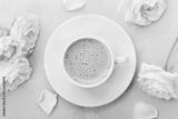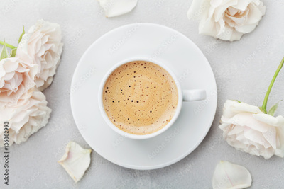 Coffee mug and vintage rose flowers for good morning on gray stone table top view in flat lay style. Beautiful breakfast on Mothers or Womans day.