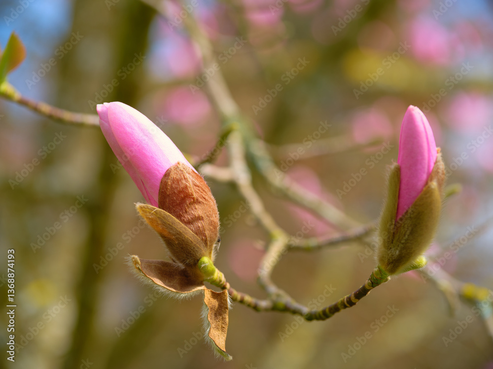 Pink magnolia buds bloom in spring sunlight against a blurred background of trees