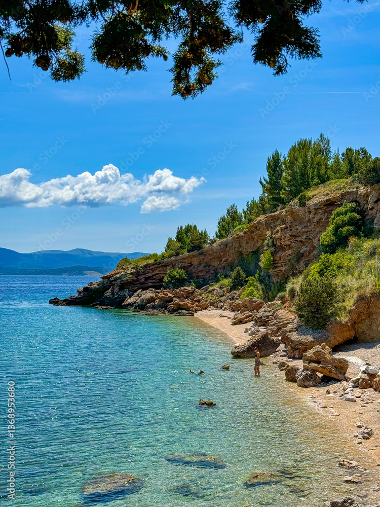 Holiday adventurer stands in shallow turquoise water beside her dog on a peaceful hidden beach surrounded by rocky cliffs and pine trees. Young woman is exploring scenic Croatian island with her pet.