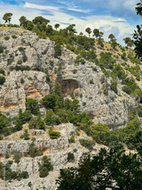 Rugged limestone mountain landscape with scattered pine trees and a prominent natural cave carved into the cliffside. Natural beauty of a Mediterranean region under bright sky with scattered clouds.