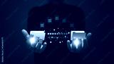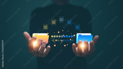 Information exchange and file transfer concept. Businessman holding folder icon for transfer file of data between folders. FTP (File Transfer Protocol). Files recovery computer backup.