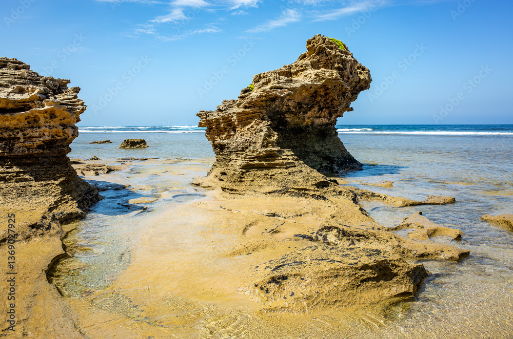 Rugged coastal rock formations and shallow pools at Point Lonsdale, Victoria, Australia, exposed at low tide, with the ocean stretching to the horizon.
