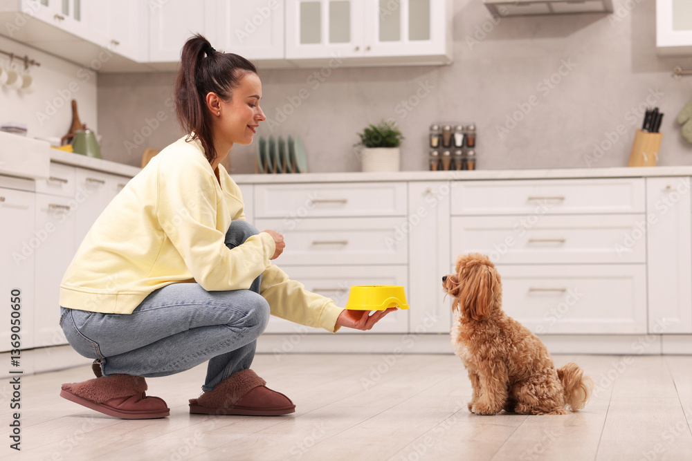 Smiling owner giving bowl with pet food to her cute dog in kitchen