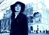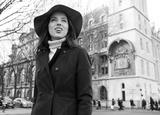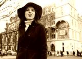 Happy beautiful young woman in town. woman walks down the street