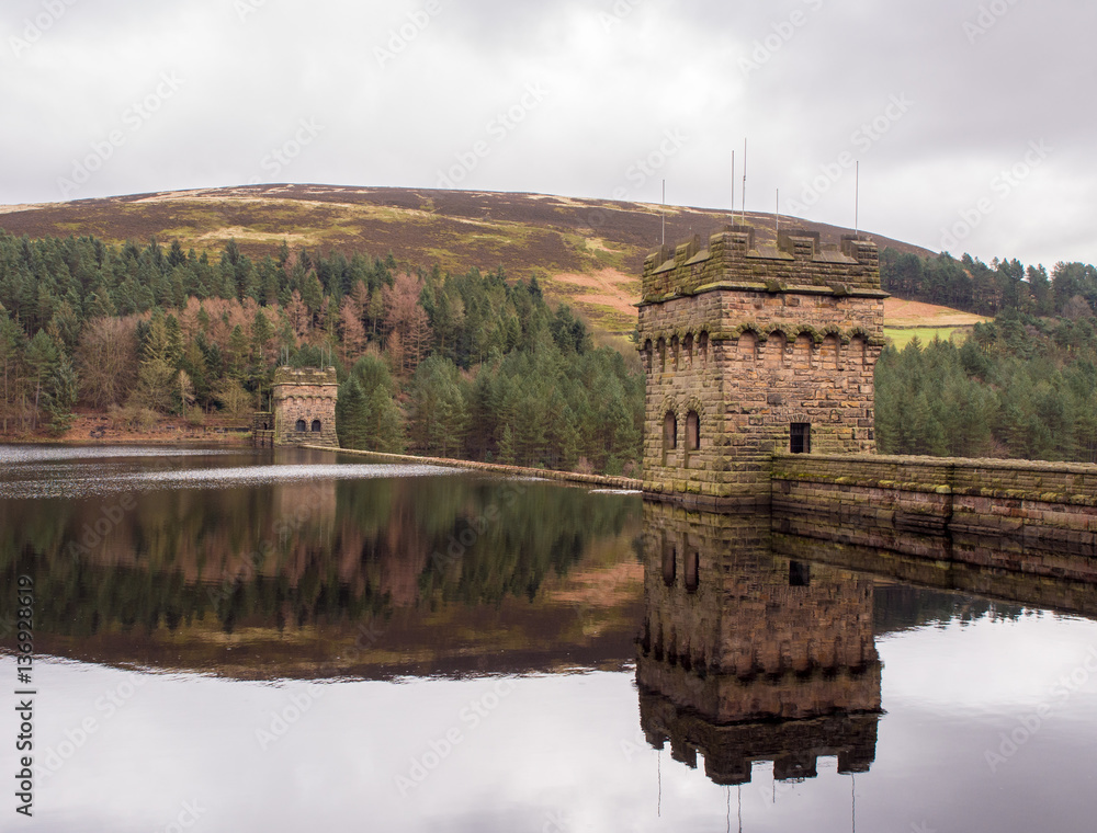 Amazing reflections at the famous dam on the Derwent Reservoir, Upper Derwent Valley, Derbyshire, UK