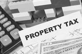 Inscription property tax with house made of toy blocks, dollar banknotes and calculator. Increasing real estate or luxury taxation. Tax payments