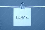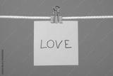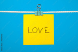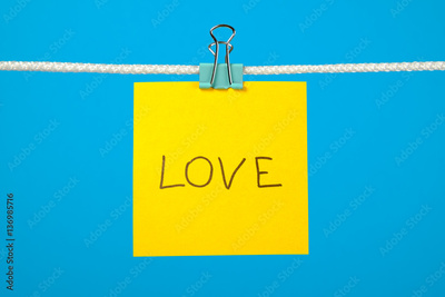 Yellow paper note on clothesline with text “Love”