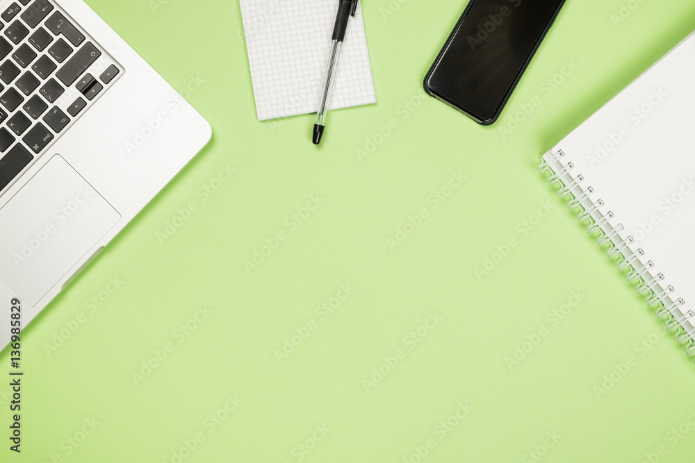 High angle view of office colored desk with copy space