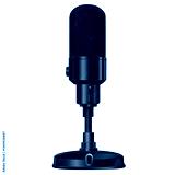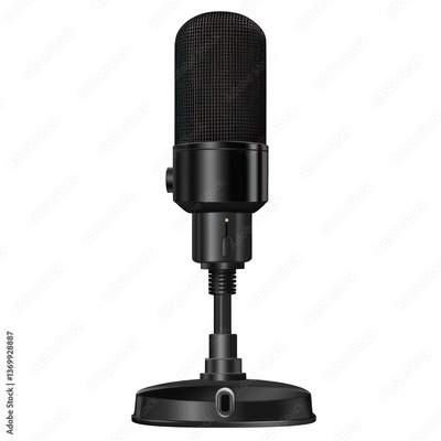 Realistic depiction of high-quality USB microphone for streaming, sleek professional design, isolated transparent PNG, English labels visible.