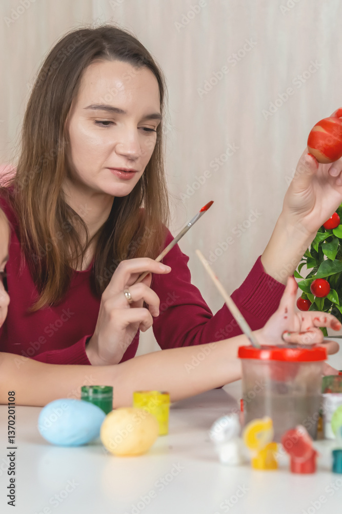 Mother and her daughter painting eggs. Happy family preparing for Easter. Cute little child girl wearing bunny ears.