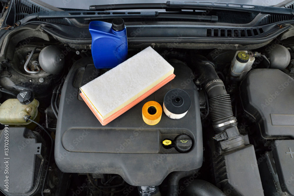 Auto parts for maintenance of a diesel engine for an engine oil change with a fuel filter, oil filter, air filter and a motor oil can
