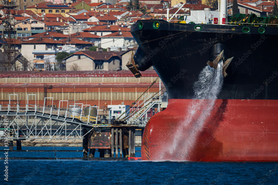Cargo ship departs from Trieste Harbor, Adriatic Sea, as water flows out from the anchor chain hole, marking the start of its transportation journey of maritime trade