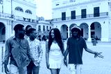group of afro caribbean cuban friends having fun and walking down a city street in Latin America, Portrait of African american young people friendship in La Havana Cuba