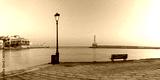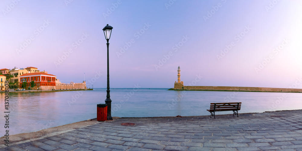 Picturesque panoramic view of old harbour with Lighthouse of Chania during morning blue hour, Crete, Greece