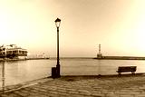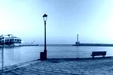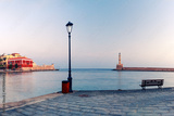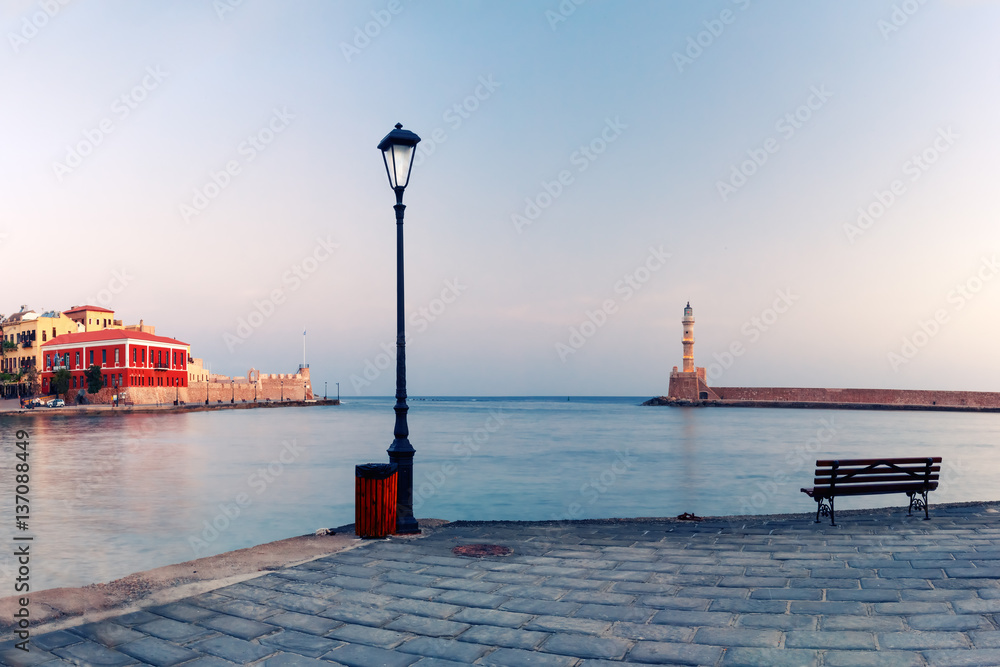 Picturesque view of old harbour with Lighthouse of Chania during morning blue hour, Crete, Greece
