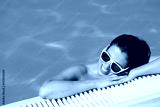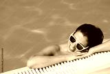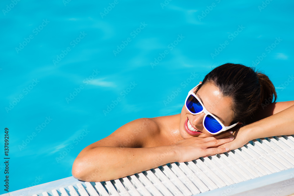 Relaxed cheerful woman in swimming pool. Summer relaxing vacation and leisure concept. Tanned female sunbathing into the water wearing white sunglasses.