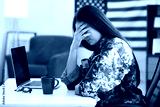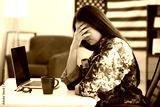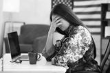 Pretty female soldier working with laptop while sitting at table in headquarters building