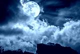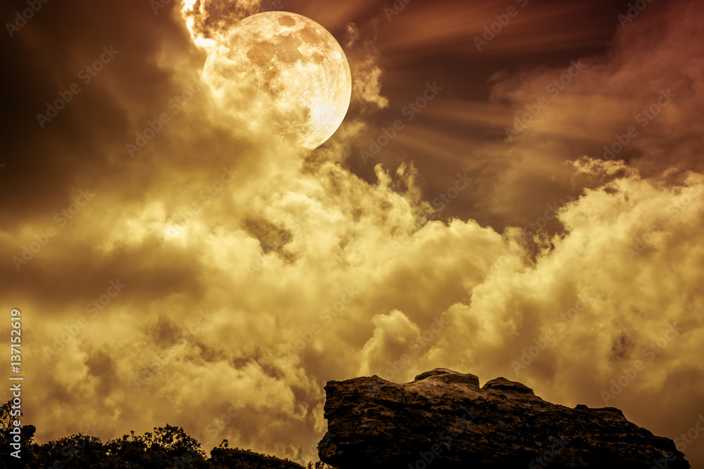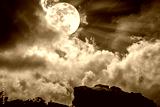 Boulder against sky with clouds and beautiful full moon. Outdoors. Sepia tone.