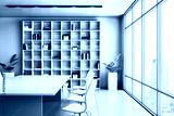 Modern corporate meeting room with white chairs, bookshelf, large windows, and city view in high-rise office interior design setting. 3D Rendering