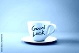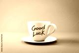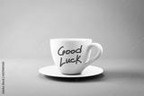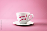 White coffee cup with Good Luck text on pink background. 3D Rendering