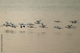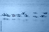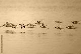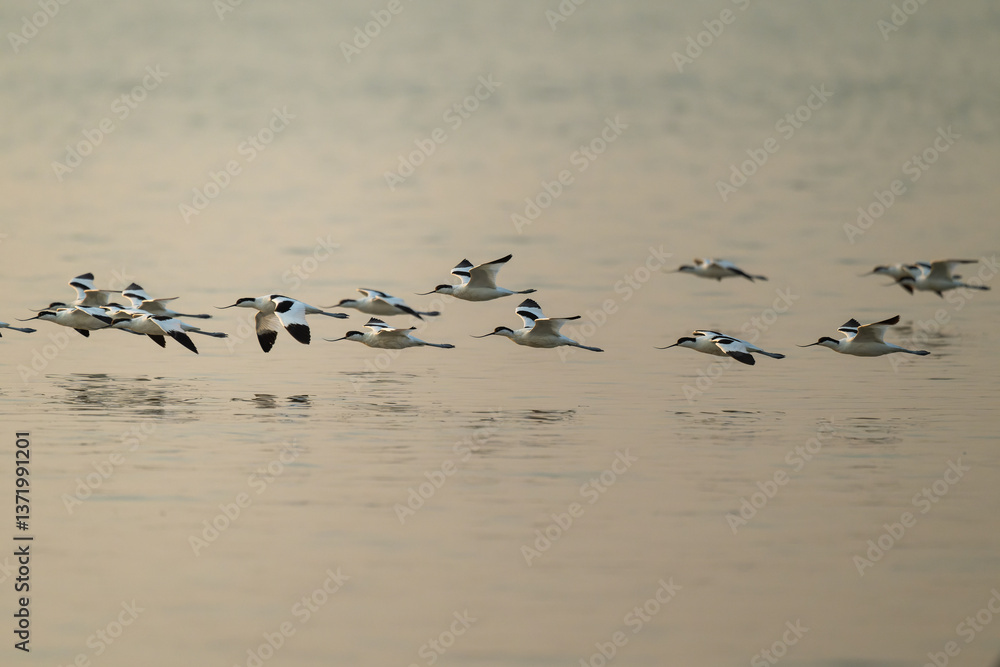 Graceful Avocets Gliding in Unison Over Tranquil Waters