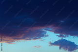 .Stormy dramatic sky background with huge blue grey cloud yellow red and orange clouds. Sunset skyline. Storm on the beach