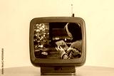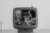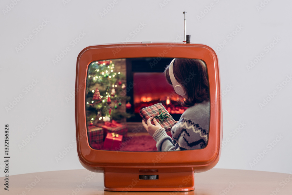 Tv showing movie of Woman in headphones with christmas gift box in hand sitting on fluffy plaid near fireplace and christmas tree.