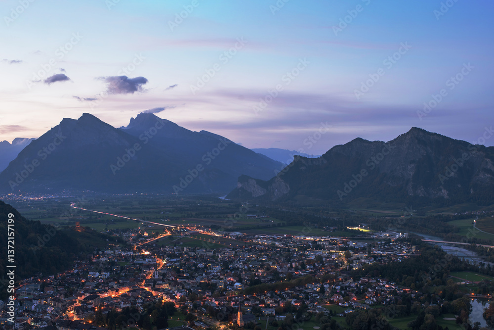 Panorama of the city of Bad Ragaz against the background of the Swiss Alps at sunset. Bad Ragaz Switzerland. Aerial view. Top view