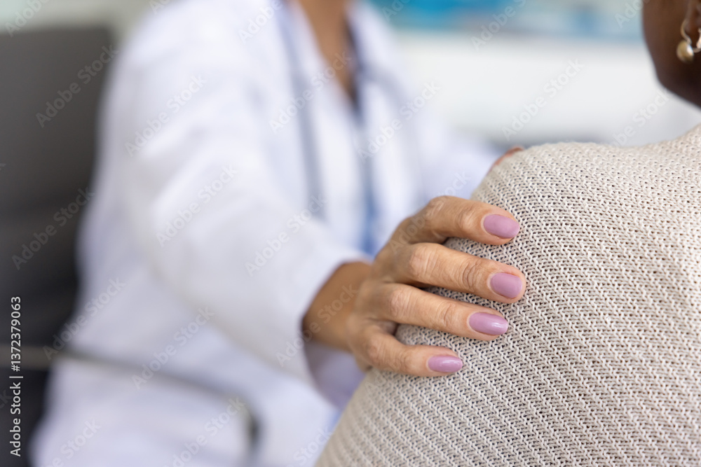 Hand of female doctor touching shoulder of patient woman, giving support, hope for treatment, therapy, beating illness, telling bad news, expressing sympathy, compassion. Close up cropped shot