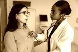 Senior Caucasian woman visiting clinic for heart and lungs checkup. Focused young African doctor listening to patient breath, using stethoscope, asking to inhale and exhale