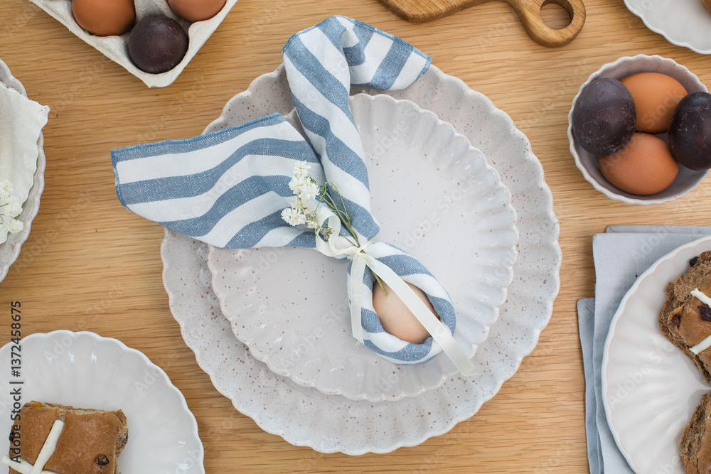 Easter egg wrapped in linen napkin in the shape of bunny with ears. Happy Easter