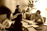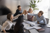 Team giving high five at corporate meeting event in boardroom. Group of colleagues celebrating joint success and professional achievement. Gesture symbolizing teamwork, collaboration, shared victory