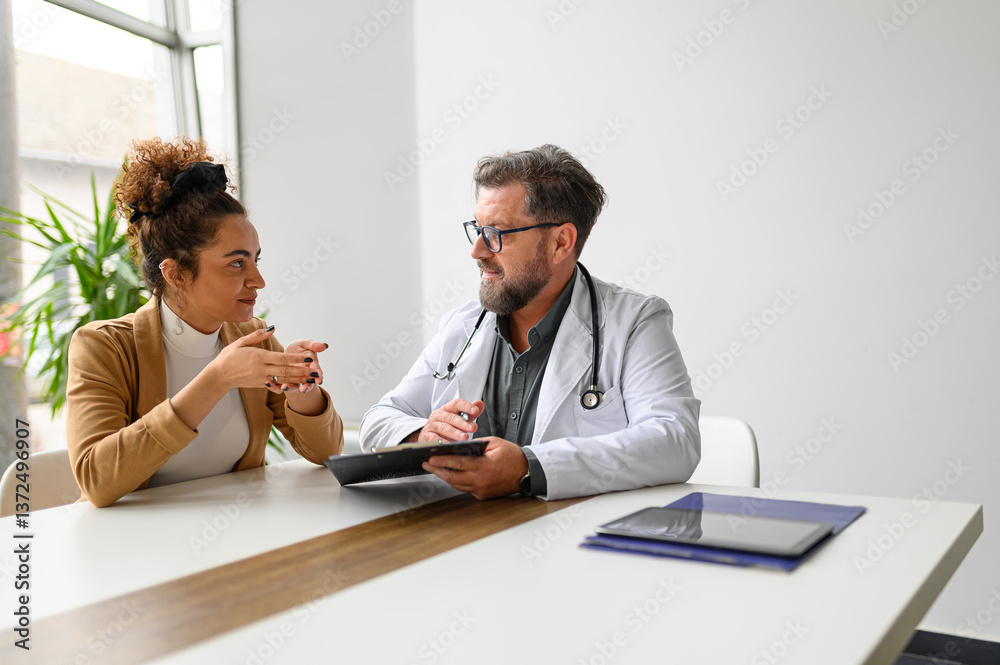 Male general practitioner with clipboard discussing medical records with female patient at desk in clinic