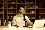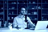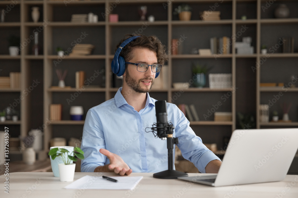 Confident young man in modern digital headphones speak in professional microphone before notebook screen hosting moderating virtual event leading remote business training live streaming broadcasting