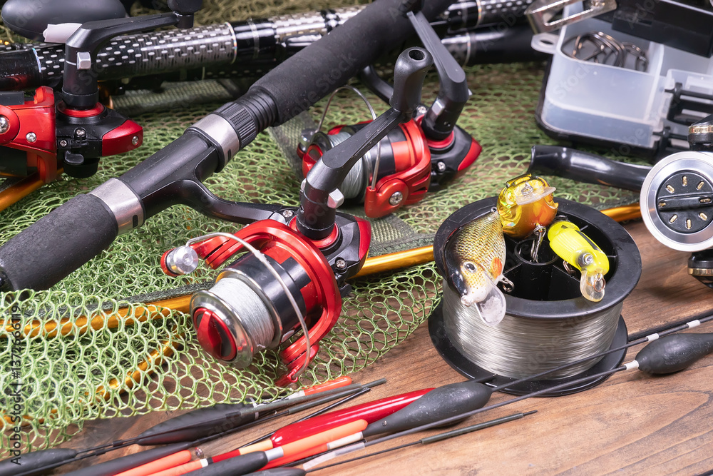 Fishing tackle on the table in a composition.