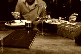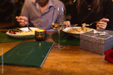 Romantic dinner date. Boyfriend gifts his girlfriend red rose and gift on a romantic dinner for Valentine's day.