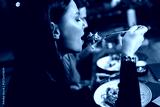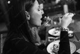 Happy couple having romantic dinner date in a fancy restaurant. They eat delicious dishes.