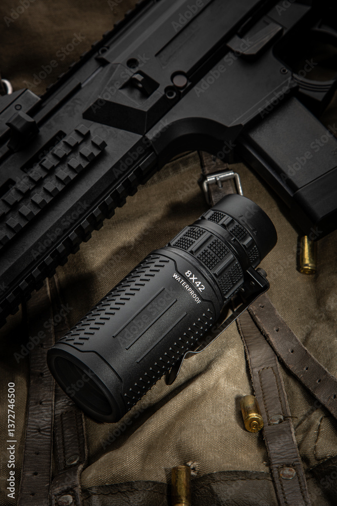 Resting on khaki fabric, a black rifle with a waterproof monocular and scattered bullets creates a rugged tactical scene.