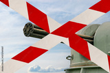ship automatic gun crossed with white and red barrier tape. concept of prohibition of arms supplies to warring countries