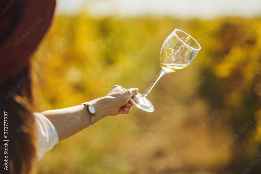 Female Sommelier Tasting Wine on Sunlight Autumn Vineyard, Close-up