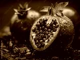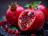 Freshly cut pomegranate showing juicy seeds with droplets of water on a dark surface