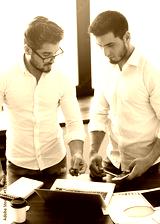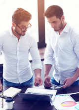 two young businessmen working on laptop at modern office.