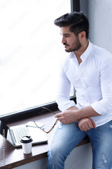 young hipster businessman working on laptop at modern office.