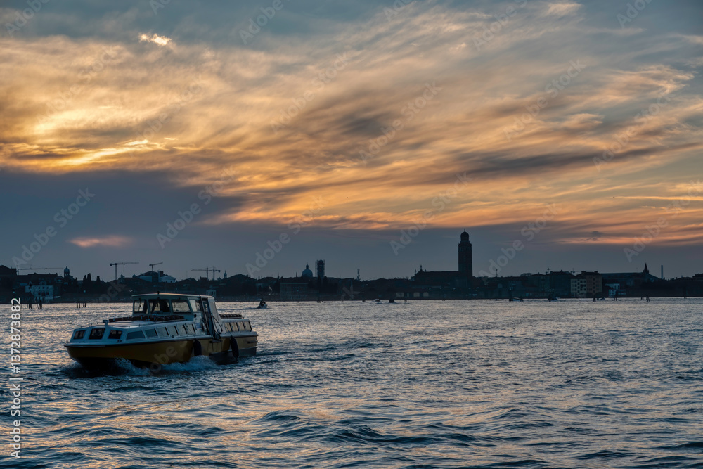 At sunset, a small boat glides near Murano Island, nestled in the Venetian lagoon, bathed in golden hues and serene waters.