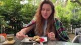 beautiful young woman eats healthy food sushi, japanese cuisine on terrace and enjoys meal