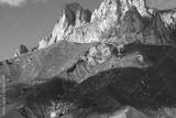 Rocky mountains with a vertical pointed elongated peak against a blue sky.