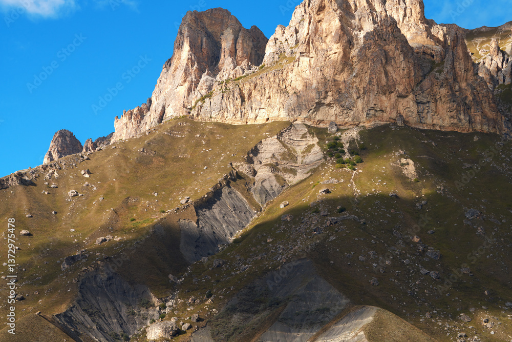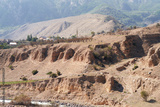 Slipped ground masses (landslide) with residential houses and gardens on the bank of a mountain river. The river bank is eroded and destroyed.